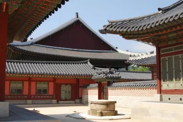 Gyeongbokgung (경복궁, 景福宮), aussi appelé palais de Gyeongbokgung ou palais de Gyeongbok, est un palais royal situé au nord de Séoul en Corée du Sud. D’abord construit en 1394 puis reconstruit en 1867, il est le principal des cinq grands palais construits sous la dynastie Joseon. Le nom du palais, Gyeongbokgung, signifie « palais du Bonheur resplendissant ». Sa porte principale est la porte de Gwanghwamun. Source Wikipedia.