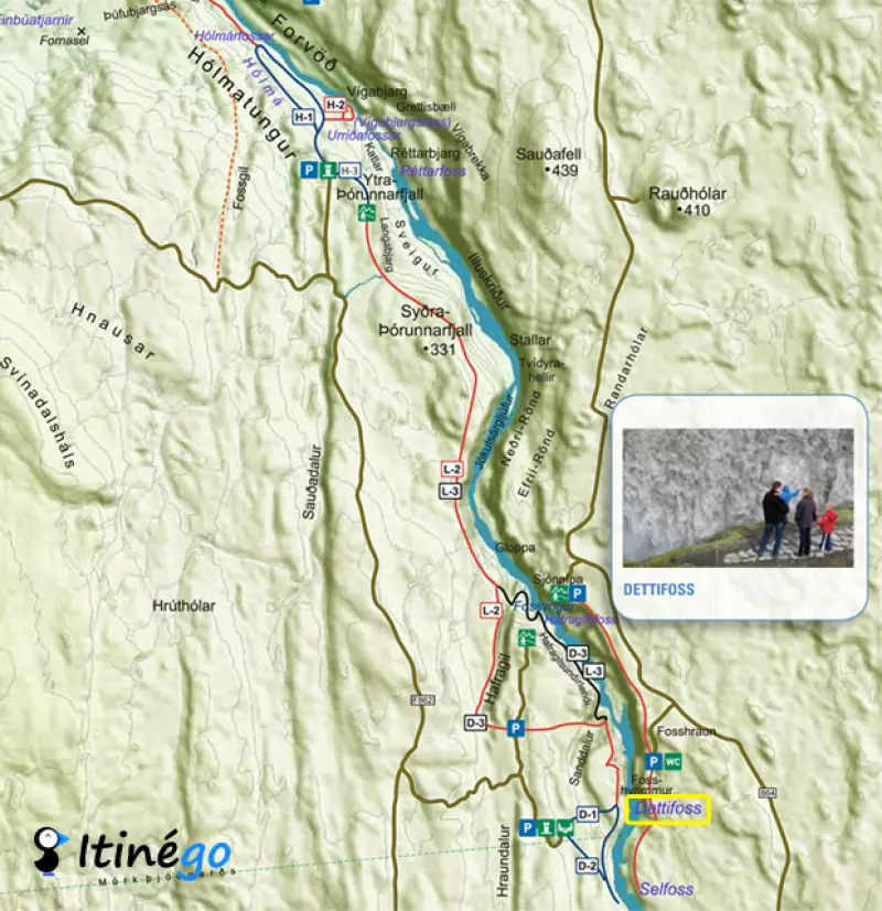 | D-1 Dettifoss | 1.5 | facile | Dettifoss parking – Dettifoss – retour | Dettifoss, canyon Jökulsárgljúfur | D-2 Dettifoss loop | 2.5 | facile | Dettifoss parking – Dettifoss – Selfoss – Dettifoss parking | Dettifoss, canyon Jökulsárgljúfur, Selfoss, la rivière en amont | D-3 Hafragil lowlands | 6.0 | difficile | Parking area east of Hafragil – Hafragil – Hafragil lowlands – Sanddalur – parking area | Sources, rivière Jökulsá, Chute d'Hafragil et le canyon. La marche la plus spectaculaire de la région de Jökulsárgljúfur. |